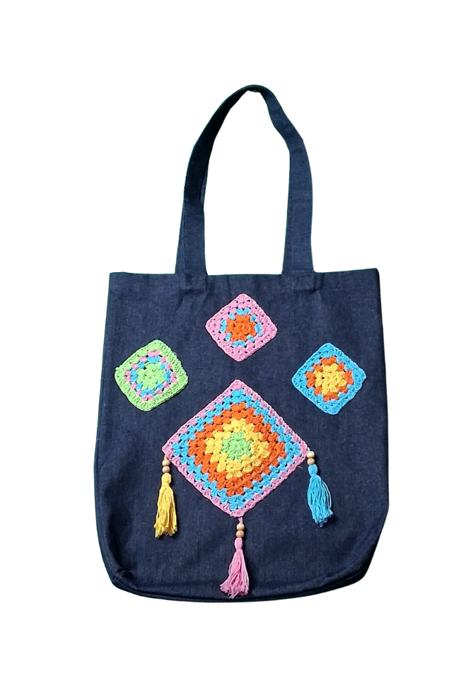 Bu büyük boy kot çanta, canlı el örgüsü motifleri ve el yapımı püskül detaylarıyla fark yaratır. Günlük kullanım için pratik olduğu kadar şık da olan bu tasarım; el emeği ile hazırlanmış, her biri benzersiz motiflerle süslenmiştir.
